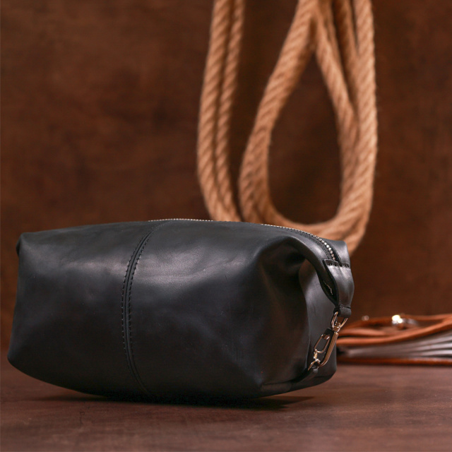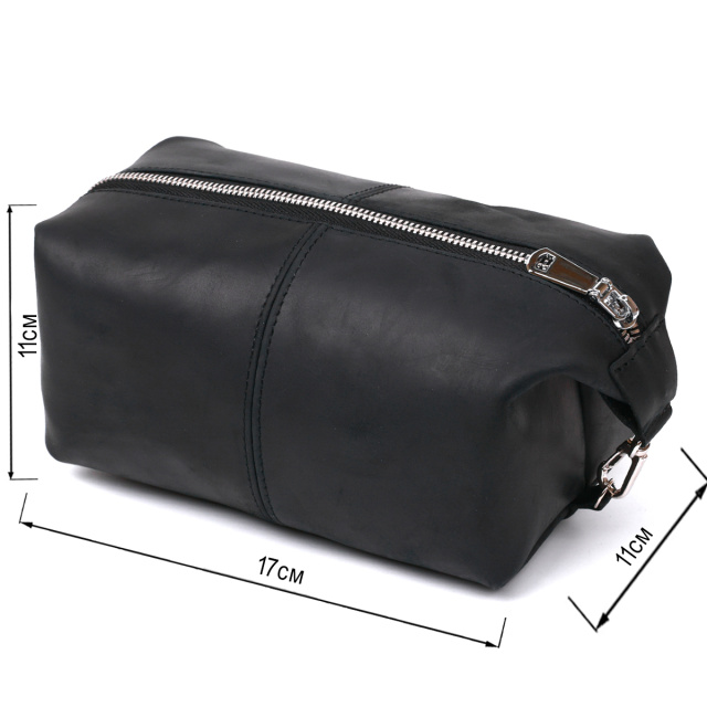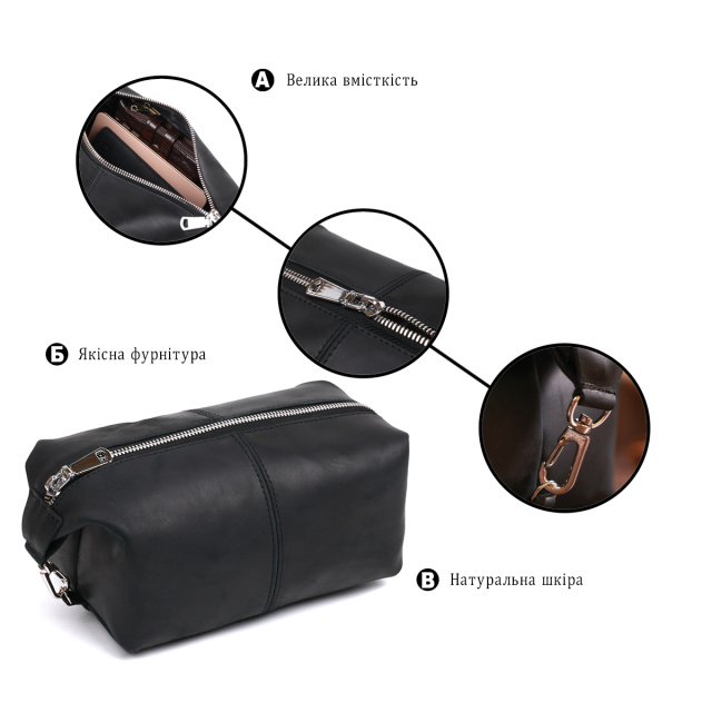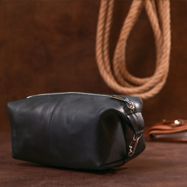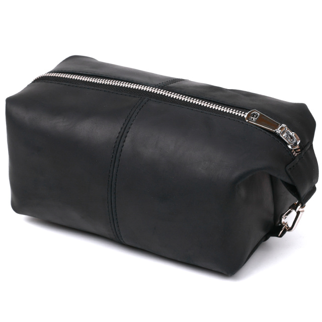 Отличная косметичка в красивом и строгом дизайне от украинского производителя. Материал изготовления – натуральная кожа высокого класса и прочности, что чувствуется сразу, как только Вы возьмёте аксессуар в руки. Данная модель имеет универсальный и практичный черный цвет и гладкую матовую фактуру. Такая косметичка станет отличным, а главное полезным подарком, дорогому человеку.