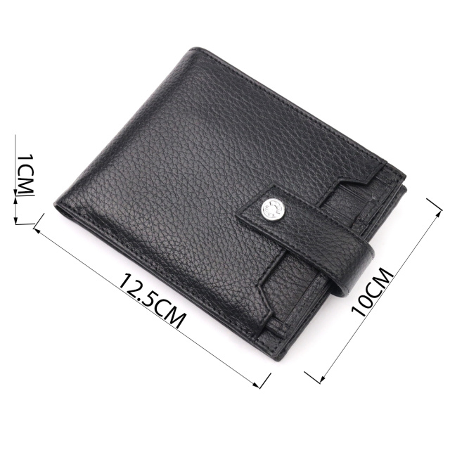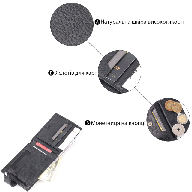 Отличный мужской кошелек из натуральной кожи, в классическом черном цвете. С наружной стороны находится карман с блоком под карточки и документы. Закрывается кошелек хлястиком с кнопкой. Обладает стандартным горизонтальным форматом, помещается в карман. Изделия из натуральной кожи всегда будут отличным подарком для близкого человека.