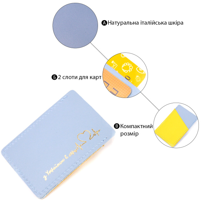 Патриотичный стильный картхолдер выполнен из кожи высокого класса, в комбинации двух цветов, желтого и голубого, с золотистой надписью “З Україною в серці”. Изделие имеет два карманчика для хранения карт, аксессуар небольшого размера и с легкостью поместится в карман или маленькую сумку. В комплекте к изделию идет фирменный фетровый чехол.