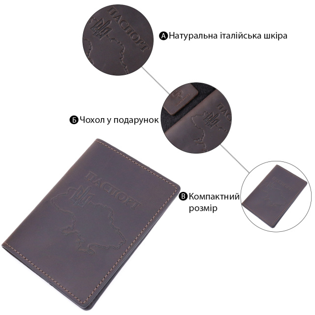 Обложка из винтажной кожи для защиты из качественной итальянской кожи с патриотическим тиснением карты Украины. Особенностью кожаной обложки есть то, что она надежно защищает документ от повреждений и имеет долгий срок службы. Изделие без застежки, упаковано в фирменный чехол из фетра. Кожаная обложка на паспорт станет отличным подарком на любой праздник.
