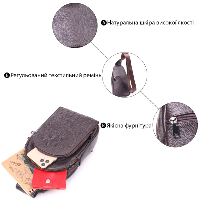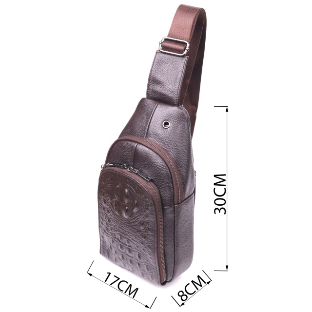 Практичная мужская сумка слинг через плечо из натуральной высококачественной кожи с отменными характеристиками качества и износостойкости. Аксессуар имеет довольно вместительное основное отделение и дополнительные карманы на внешней и тыльной стороне для вещей, которые должны быть быстро доступны. Акцент сумки, в виде тиснения под крокодила, придает ей стильного и интересного вида. Ремень можно регулировать по длине, выполнен он из высокопрочного текстиля. Кожаная сумка, всегда была отличным подарком для родных и близких людей.