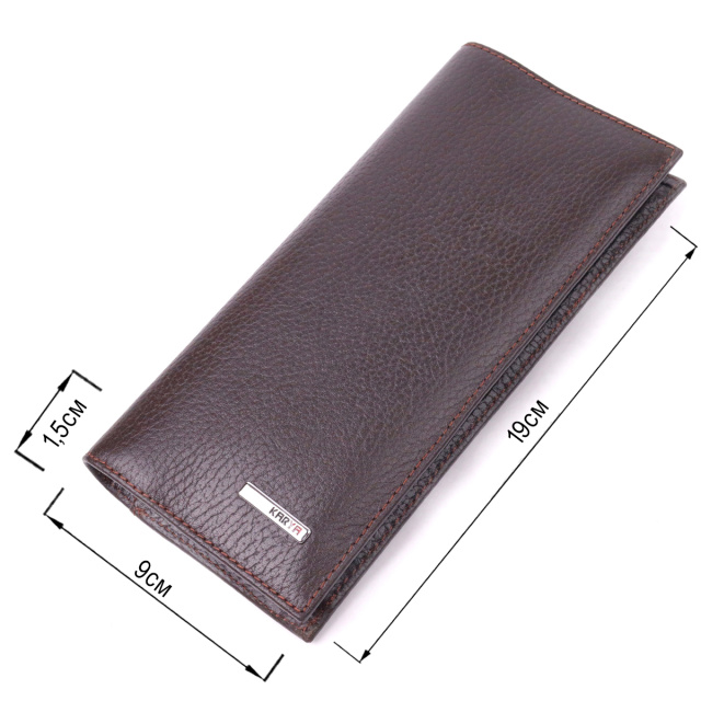 Удобное мужское портмоне из натуральной зернистой кожи в красивом коричневом цвете. Изделие имеет продуманный до мелочей дизайн и качественную фурнитуру, очень практичное. В портмоне помещаются купюры в развернутом виде. Дополнен аксессуар блоком для кредиток, который извлекается, он располагается внутри кошелька в специальном кармашке. Изделие удобно лежит в руке. Отличный подарок для ваших близких.