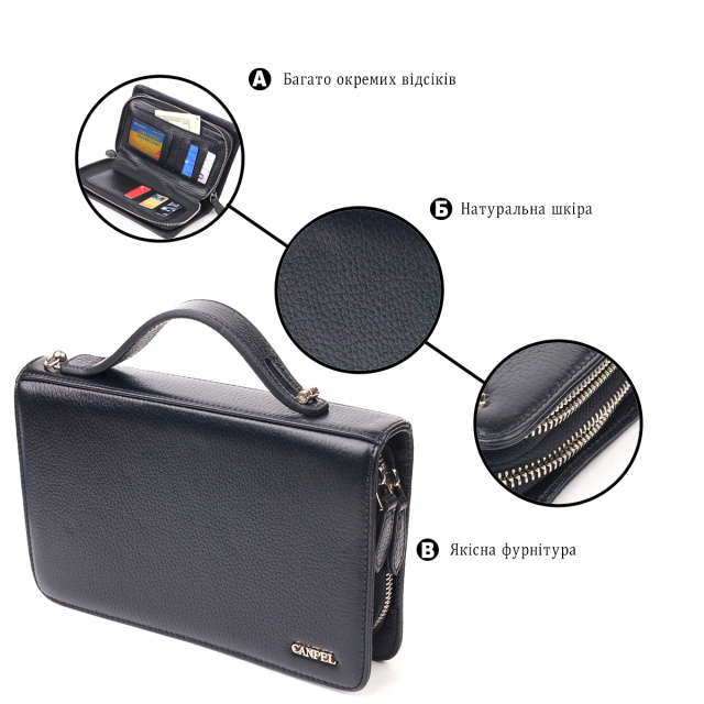 Стильный клатч из натуральной зернистой кожи. Отлично сидит в руке, на внешней стороне, в правом углу расположен металлический логотип производителя. Клатч имеет оптимальный функционал, все карманчики оптимально продуманные для Вашего удобства. Кожаная барсетка станет прекрасным подарком для любого мужчины.
