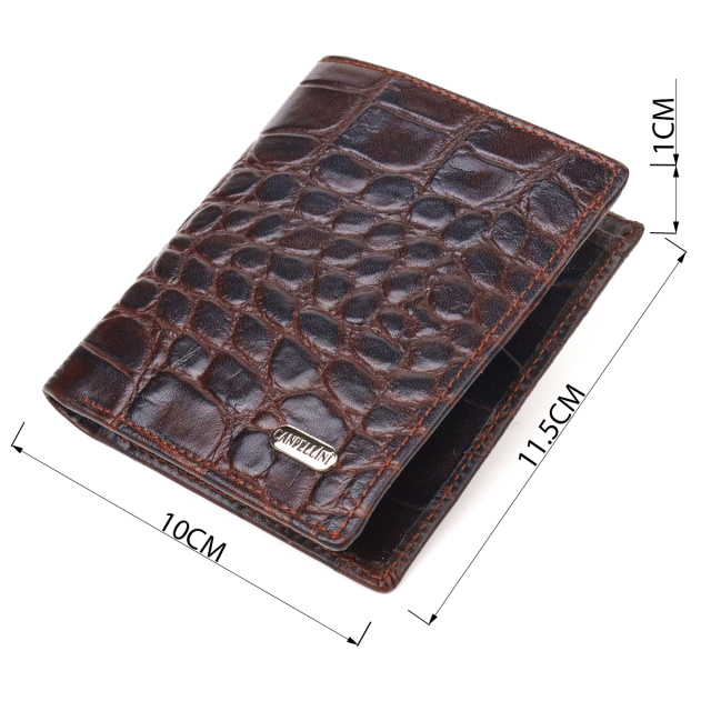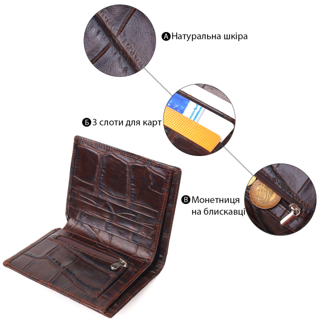 Оригинальное портмоне для мужчин, из натуральной фактурной кожи, с тиснением под крокодила. Аксессуар имеет одно основное отделение, с перегородкой, в которое помещаются купюры всех номиналов, три отсека для карточек, монетницу на молнии с расширителем, два прилегающих кармана. На внешней стороне, металлический логотип производителя. Цвет фурнитуры – серебро. Кожаный кошелек является действительно нужным подарком на все случаи жизни.