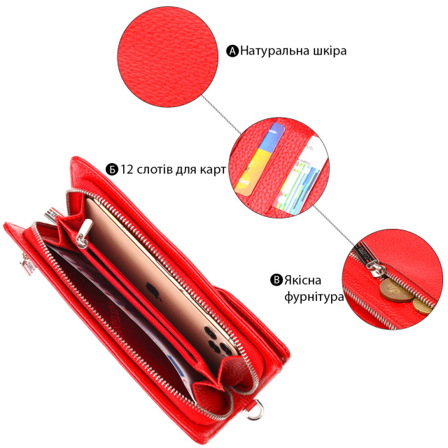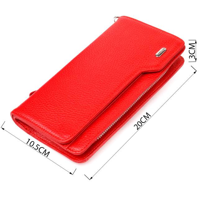 Вместительный женский кошелек- клатч, из натуральной зернистой кожи, в ярком красном цвете. Аксессуар имеет одно основное отделение, в которое помещаются купюры всех номиналов, двенадцать карманов для карточек, один из которых под сеточкой, блок для карт с внешней стороны, два кармашка на молнии, съемный кистевой ремень. Закрывается аксессуар на молнию, а блок для карт закрывается на кнопки. Цвет фурнитуры – серебро. Кожаный кошелек является удивительным подарком для жены, девушки, подруги.