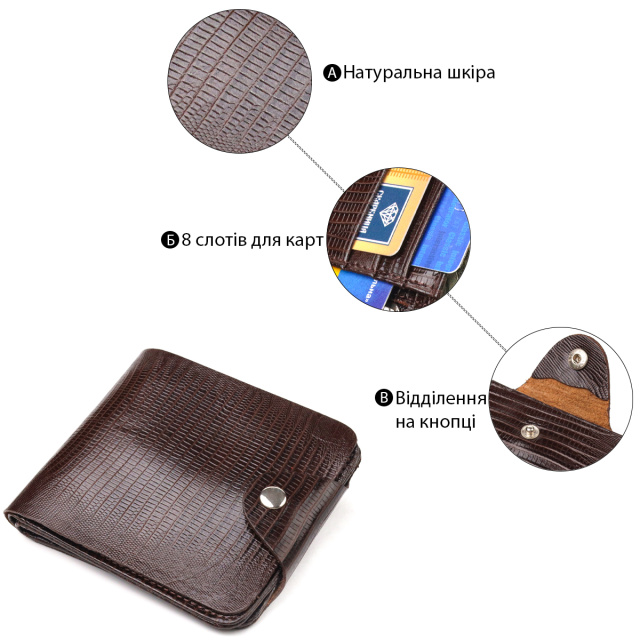 Модный мужской кошелек из натуральной фактурной кожи с тиснением под рептилию. Аксессуар имеет одно отделение для купюр, в которое помещаются купюры всех номиналов, четыре прилегающих кармана, карман на молнии, на всю длину кошелька, а также восемь отсеков для карточек, один из них под сеточкой. Закрывается модель хлястиком на кнопку. В современном мире кожаное портмоне является просто необходимой вещью, а качественное кожаное портмоне является еще и неплохим вложением денег, так как прослужит не один год.