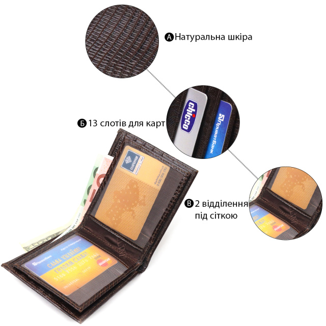 Оригинальный мужской кошелек из натуральной кожи с тиснением под рептилию. Аксессуар имеет два отделение для купюр, в которые помещаются купюры всех номиналов, два прилегающих кармана, а также тринадцать отсеков для карточек, один из них под сеточкой. В современном мире кожаное портмоне является просто необходимой вещью, а качественное кожаное портмоне является еще и неплохим вложением денег, так как прослужит не один год.