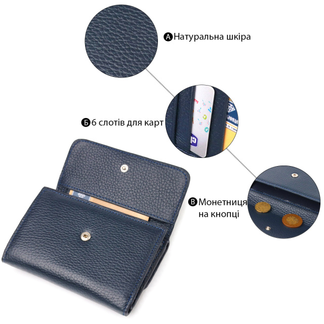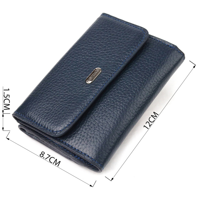 Стильный женский кошелек, из натуральной зернистой кожи флотар. Аксессуар имеет одно основное отделение, в которое помещаются купюры всех номиналов, семь карманов для карточек, один из которых под сеточкой, монетница с внешней стороны, а также три скрытых кармана. Закрывается аксессуар клапаном на кнопку, также, как и монетница. Цвет фурнитуры – серебро. Кожаный кошелек высокого качества всегда будет достойным подарком для родных и близких людей.