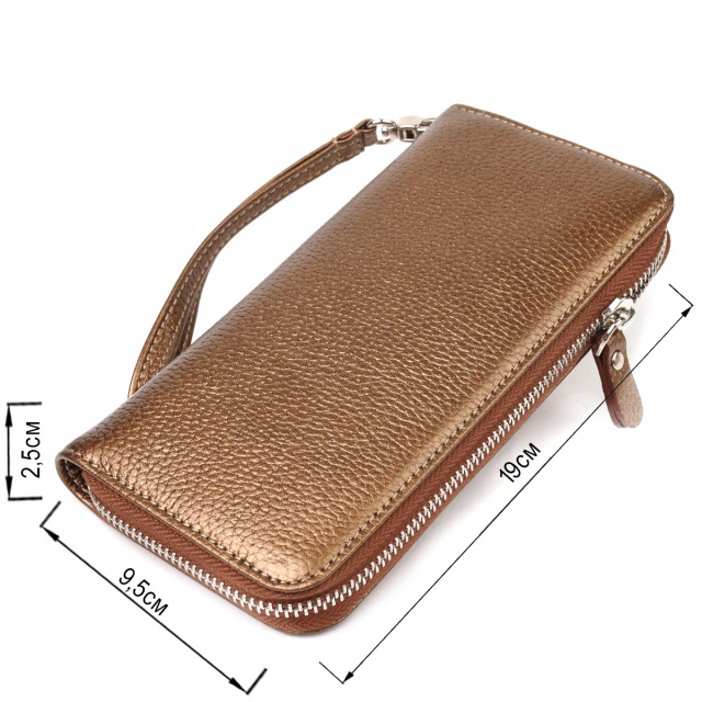 Изумительный женский кошелек, из натуральной кожи коричневого цвета с едва уловимым золотистым блеском. Аксессуар имеет три основных отделения, в которые помещаются купюры всех номиналов, две перегородки, одна из них на молнии, восемь карманов для карточек, два прилегающих кармана и съемный кистевой ремень. Закрывается аксессуар на молнию. Отличный аксессуар, надежного производителя, который прослужит очень долго.