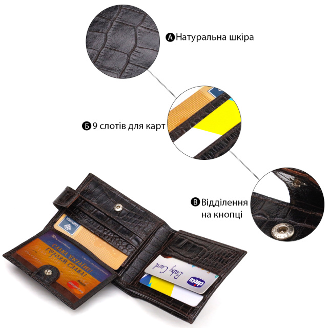 Модный мужской кошелек, из натуральной фактурной кожи, с тиснением под крокодила. Аксессуар имеет одно основное отделение с перегородкой, в которое помещаются купюры всех номиналов, девять карманов для карточек, два из которых под сеточкой, монетница и два прилегающих кармана. Закрывается аксессуар хлястиком на кнопку. Цвет фурнитуры – серебро. Вы легко сможете поместить его в карман брюк или маленькую сумку. Упакован бумажник картонную коробку. Кожаный кошелек является отменным подарком для родных и близких людей.