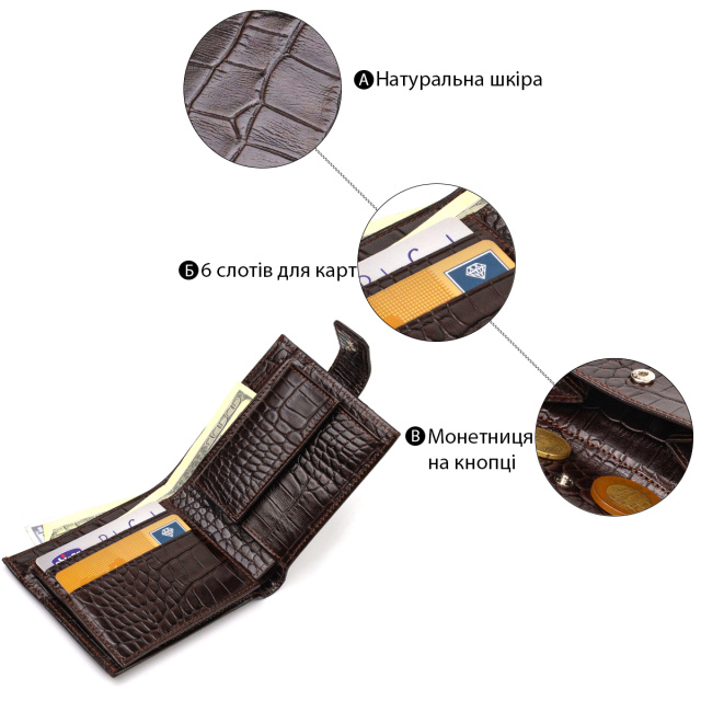 Модное мужское портмоне из натуральной фактурной кожи с тиснением под крокодила. Аксессуар имеет одно основное отделение с карманом-перегородкой, в которое помещаются купюры всех номиналов, шесть карманов для карточек, карман под сеточкой для документов и монетницу. Закрывается аксессуар пополам кожаным хлястиком на кнопку. Упакован бумажник картонную коробку.