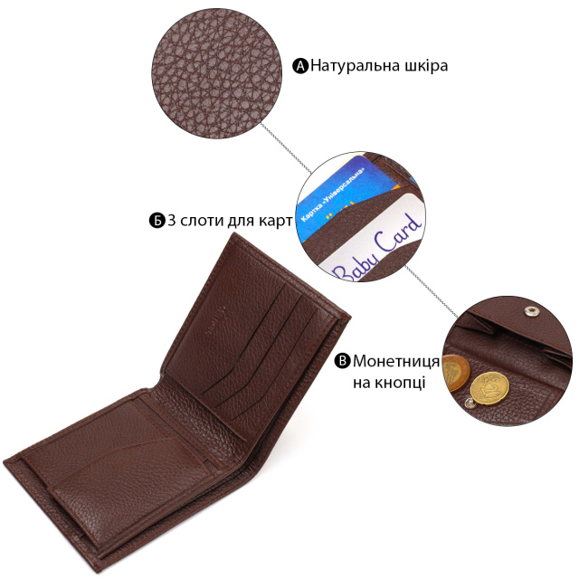 Стильный мужской кошелек из натуральной зернистой кожи. Аксессуар имеет одно основное отделение с тканевой перегородкой в которое помещаются купюры всех номиналов, три кармана для карточек, два прилегающих кармана и монетницу. Закрывается аксессуар пополам, без застежки. На лицевой стороне, в правом нижнем углу металлический логотип компании производителя. Приобретая кожаный аксессуар этой фирмы, себе или на подарок, будьте уверены, что он прослужит Вам не один год.