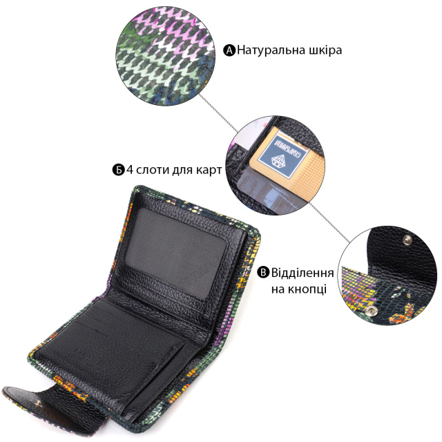 Женский фактурный кошелек из натуральной кожи, изделие имеет красочный цветочный принт снаружи и чисто черный внутри. Аксессуар состоит из одного основного отделения с тканевой перегородкой в которое помещаются купюры всех номиналов, четырех карманов для карточек (один под сеточкой), трех скрытых кармана и монетницы. Закрывается аксессуар пополам хлястиком на кнопку. Приобретая кожаный аксессуар этой фирмы, себе или на подарок, будьте уверены, что он прослужит Вам не один год.