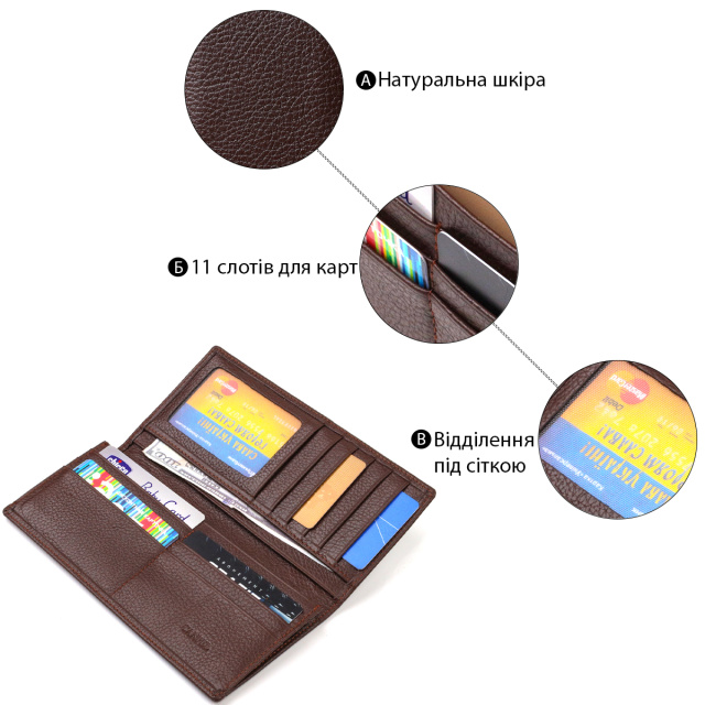 Вместительный мужской кошелек из натуральной кожи. Аксессуар имеет одно основное отделение для купюр всех номиналов, одиннадцать ячеек для карточек, карман под сеточкой для пропуска, два скрытых кармана и монетницу на молнии. Закрывается аксессуар пополам без застежки. На лицевой стороне, в правом нижнем углу металлический логотип компании производителя. Приобретая кожаный аксессуар этой фирмы, себе или на подарок, будьте уверены, что он прослужит Вам не один год.
