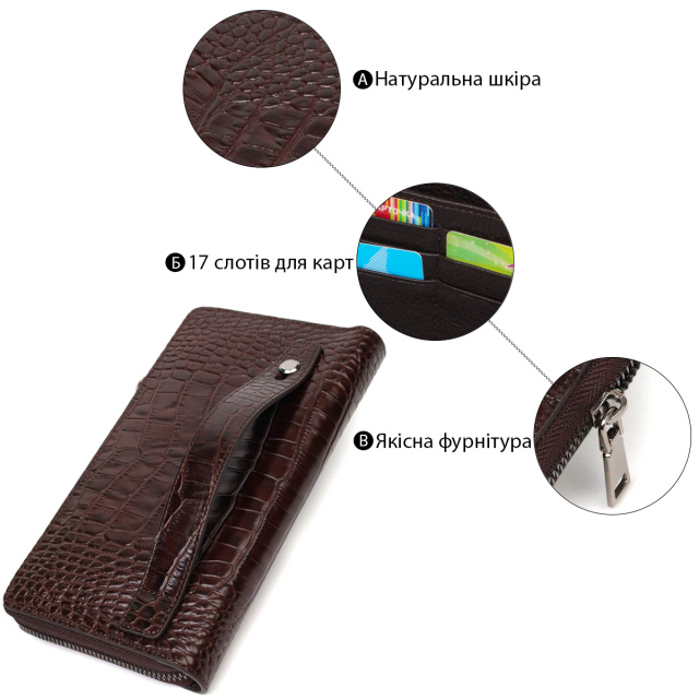 Широкий мужской клатч из натуральной кожи с тиснением под крокодила, кошелек закрывается на молнию, внутри можно без проблем размещать бумажные банкноты, банковские карты и даже смартфон. Аксессуар состоит из двух отделений для купюр, двух прилегающих карманов, семнадцати слотов для кредиток и монетницы на молнии. Имеется также ручка для ладони на тыльной стороне клатча. Продается бумажник в красивой коробке от производителя. Качественный и надежный клатч - именно такой аксессуар должен быть у каждого уважающего себя человека.