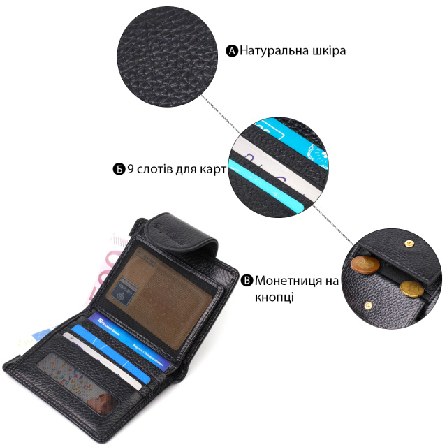 Оригинальный вместительный женский кошелек из натуральной кожи. Аксессуар состоит из двух широких отделений для купюр, девяти ячеек для пластиковых карт, двух прилегающих карманов, кармана под сеточкой и монетницы под клапаном снаружи. В изделии использована качественная фурнитура золотистого цвета. Закрывается кошелек кожаным хлястиком на кнопку. Покупая этот кожаный кошелек, Вы не только приобретаете стильную вещь, но и получаете качественный аксессуар, который прослужит не один год.