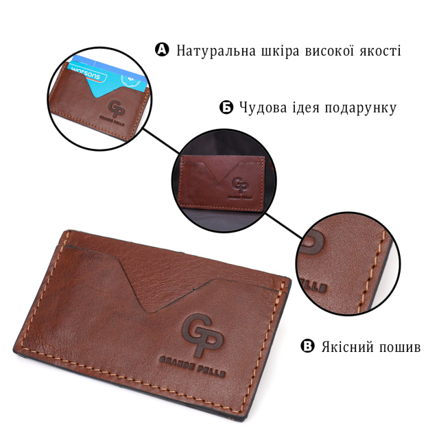 Надежный кожаный кард-кейс ручной работы из натуральной высококлассной кожи. На лицевой стороне изделие имеет тисненый логотип производителя Grande Pelle, а также прошит по краю ровной строчкой под цвет изделия. Аксессуар состоит из двух отделений под карточки. Благодаря компактным размерам аксессуара он отлично помещается в кошелек, карман или сумку любого размера. Отличный аксессуар для современного человека.
