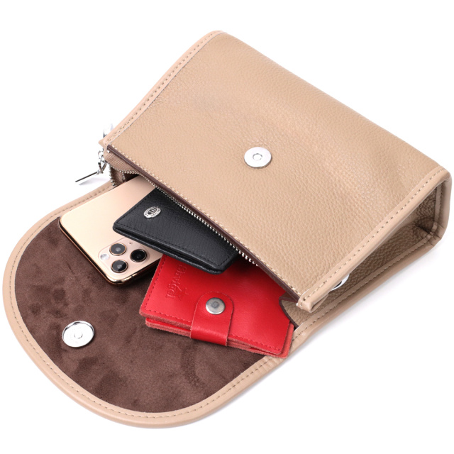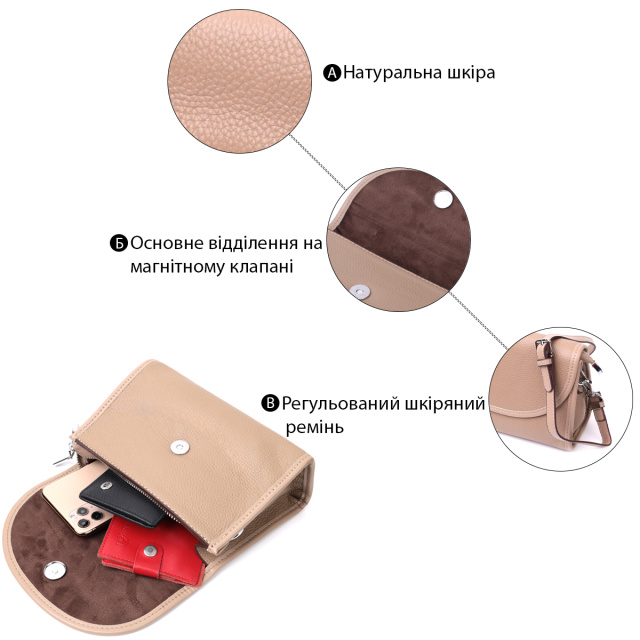 Маленькая сумочка которая закрывается на молнию и стильный полукруглый клапан на магните. Изделие пошито из качественной натуральной мягкой кожи, которая долго носится и не теряет свой первоначальный вид. Аксессуар состоит из основного отделения и потайного кармана на молнии. Носить сумку можно под рукой, на плече и через плечо, для этого имеется кожаный съемный регулируемый ремень. В изделии использована качественная фурнитура серебряного цвета. Универсальный вариант сумки который подойдет для вечера, а также отлично подойдет на каждый день.