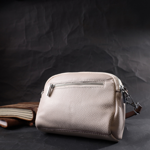 Трендовая сумка для женщин которые любят качество и комфорт. Изделие пошито из качественной натуральной кожи, которая долго носится и не теряет свой первоначальный вид. Аксессуар состоит из двух основных отделений, внутри которых карман открытого типа и потайной карман на молнии, снаружи расположен карман на молнии с тыльной стороны и карман, что закрывается клапаном на магнит, на лицевой стороне. Носить сумку можно в руке, на плече и через плечо, для этого имеется кожаный съемный ремень. В изделии использована качественная фурнитура серебряного цвета. Универсальный вариант сумки как на вечер так и в качестве сумочки на каждый день.