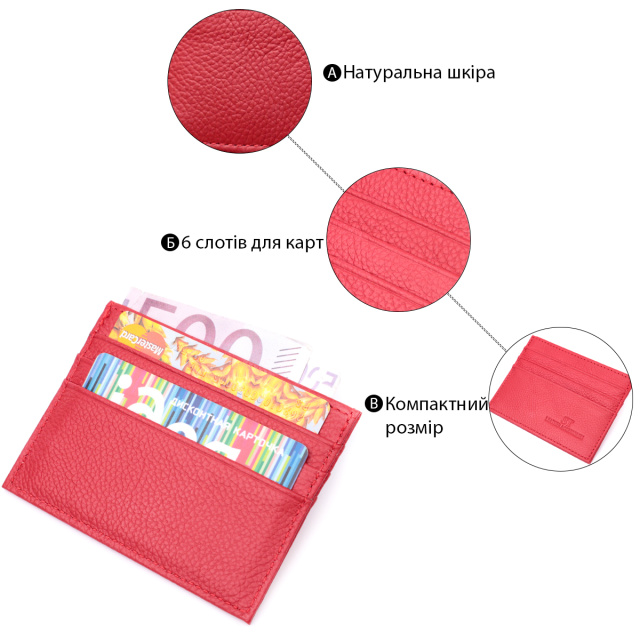 Отличный кожаный кард-кейс из натуральной высококлассной кожи. На лицевой стороне аксессуар имеет тисненый логотип производителя, а также прошит по краю ровной строчкой под цвет изделия. Изделие состоит из шести отделений под карточки и одного внутреннего кармашка, упакован в фирменную коробочку белого цвета. Благодаря компактным размерам отлично помещается в кошелек, карман или сумку любого размера. Отличный аксессуар для современного человека.