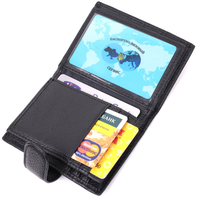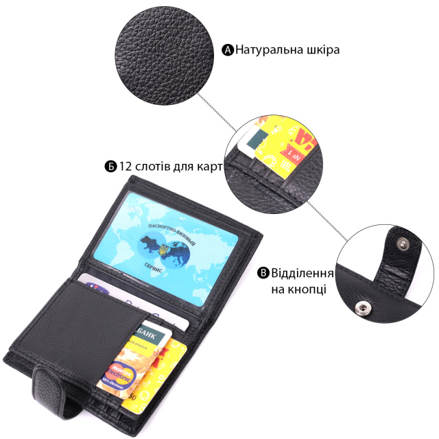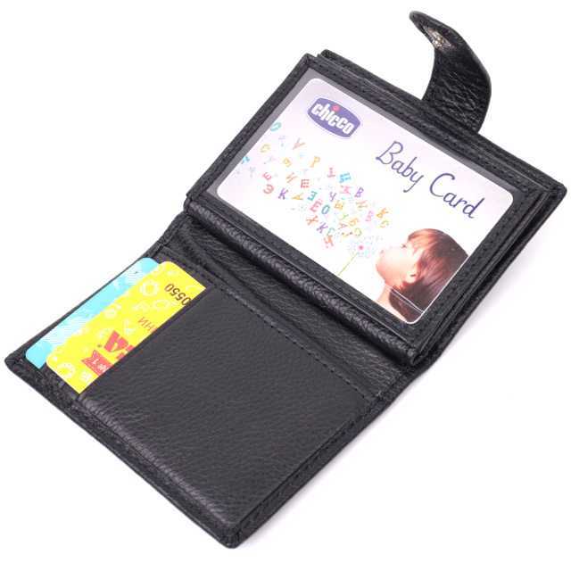 Стильная визитница для женщин в классическом черном цвете, что закрывается пополам хлястиком на кнопку. Аксессуар вместительный из натуральной кожи, он состоит из двенадцати ячеек для карт, кармана под пленкой и одного скрытого кармана. Визитница дополнена надежной фурнитурой и крепкой подкладкой.