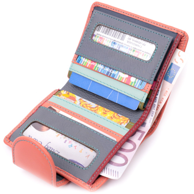 Практичное вертикальное портмоне в два сложения удобного размера из натуральной кожи высочайшего качества. Кошелек оранжевого цвета снаружи и разноцветный внутри, что очень стильно и современно. Кожаное портмоне очень практичное и служит достаточно долго. Аксессуар состоит из основного отделения с кожаной перегородкой для купюр, кармана на молнии через всю длину, монетницы, девяти ячеек для карт, прозрачного окошка для пропуска и трех скрытых карманов. Портмоне дополнено надежной фурнитурой и прошито по краю ровной строчкой бирюзового цвета. Укомплектован кошелек в фирменную картонную коробку белого цвета. Изделие станет идеальным подарком для девушки любого возраста.