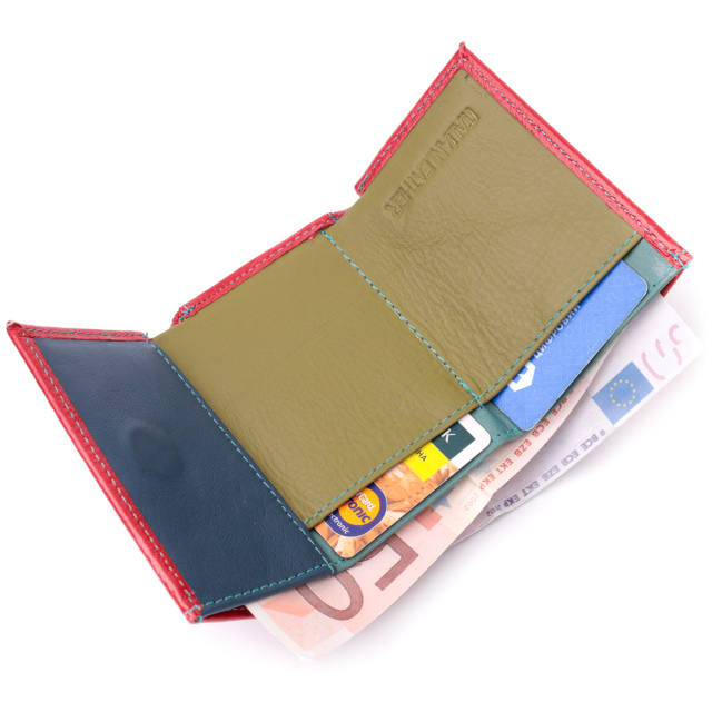 Ультрамодное женское портмоне в три сложения из натуральной кожи высочайшего качества. Акцентом этого кошелька является цвет, точнее несколько цветов - он красного цвета снаружи и многоцветный внутри. Аксессуар состоит из двух вместительных отделений для купюр, двух ячеек для карт и кармана для монет. Снаружи изделие прошито ровной строчкой бирюзового цвета по краю и украшено металлическим логотипом компании производителя. Портмоне дополнено надежной фурнитурой и крепкой подкладкой. Укомплектован кошелек в фирменную картонную коробку белого цвета.