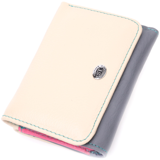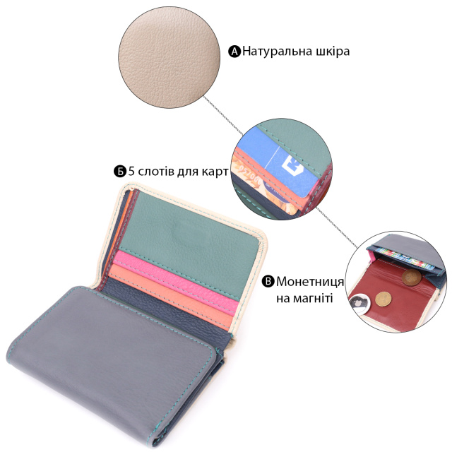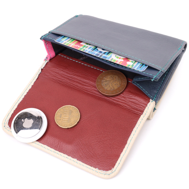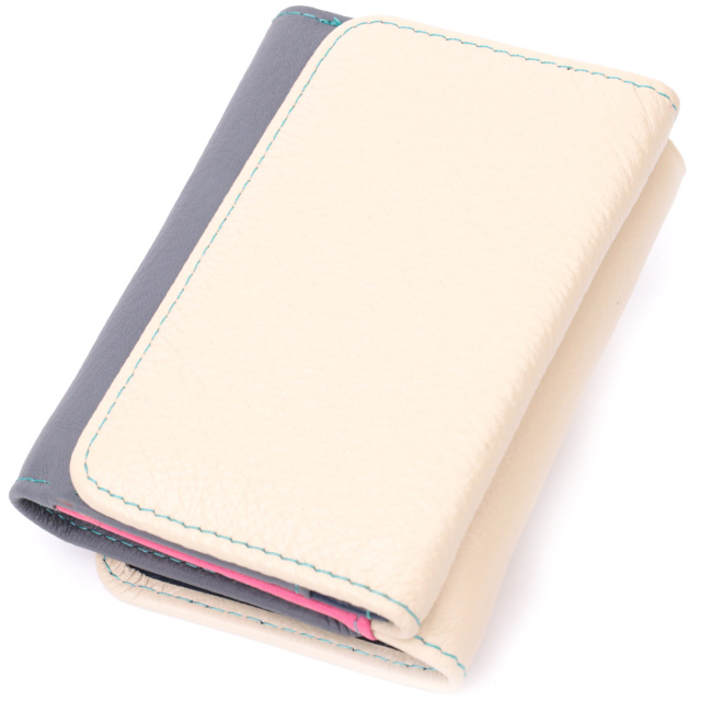 Красивый женский кошелек среднего размера из натуральной кожи. Отличительная особенность этого кошелька двухцветная наружная часть и многоцветная внутренняя часть. Данная модель тройного сложения, которая закрывается на клапан с магнитом. Внутри есть два отделения для купюр, монетница, пять слотов под пластиковые карты, одно окошко для фото, а также два скрытых отделения. Отменный функционал и удобный размер создает идеальную модель кошелька для повседневного использования.