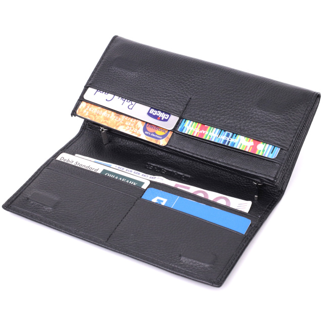 Классическое женское портмоне в два сложения из натуральной кожи высочайшего качества. Кожаное портмоне очень практичное и служит достаточно долго. Аксессуар состоит из четырех вместительных карманов для купюр, двух карманов на молниях через всю длину, восьми ячеек для пластиковых карт, скрытого кармана и наружного кармана на молнии, что отлично прослужит для монет. Портмоне дополнено надежной фурнитурой. Укомплектован кошелек в фирменную картонную коробку белого цвета.