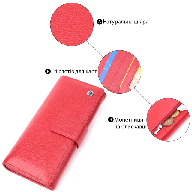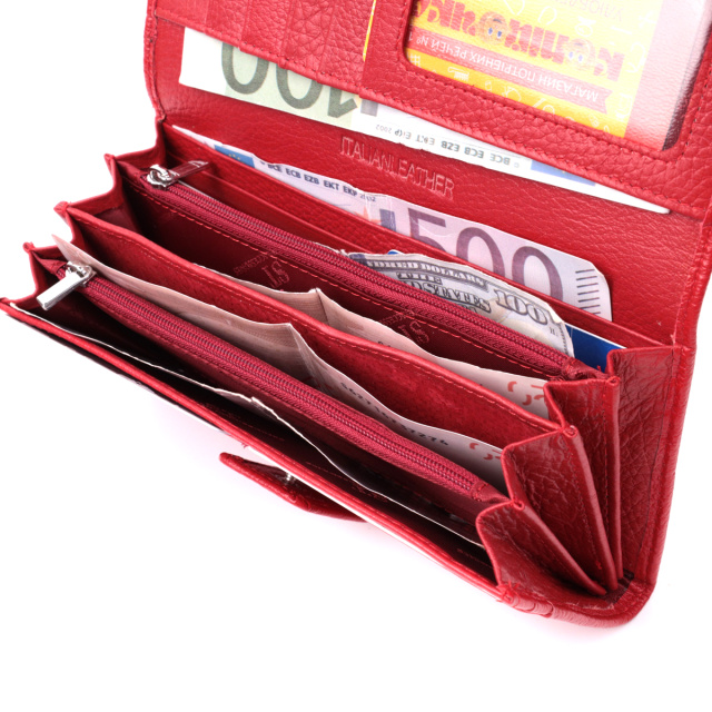 Яркое женское портмоне вертикального типа, что закрывается пополам хлястиком на кнопку. Модель пошита из качественной кожи, которая отлично проявила себя в долгосрочной эксплуатации. Аксессуар состоит из четырех отделений для купюр, двух карманов на молнии, четырнадцати ячеек для пластиковых карт, двух прилегающих карманов и монетницы снаружи. Модель упакована в коробочку, что очень удобно если изделие предназначено для подарка.