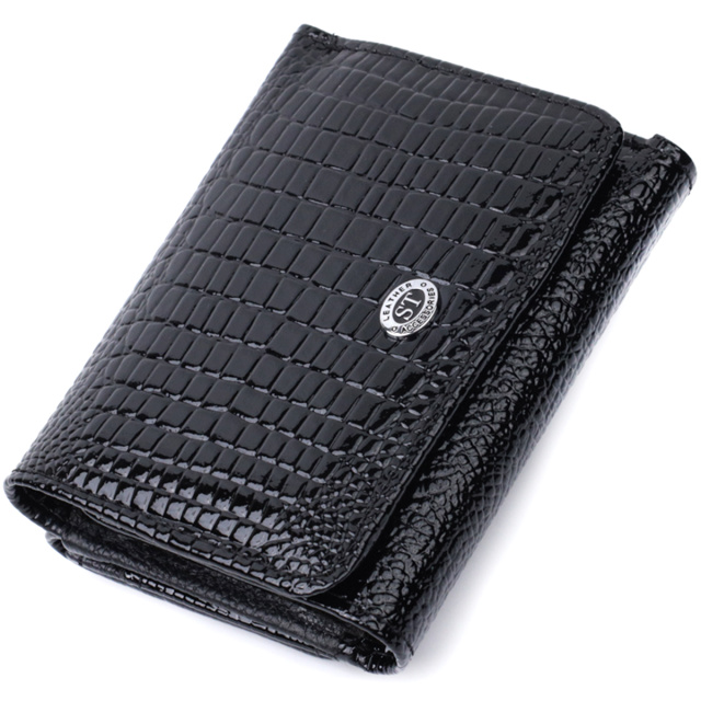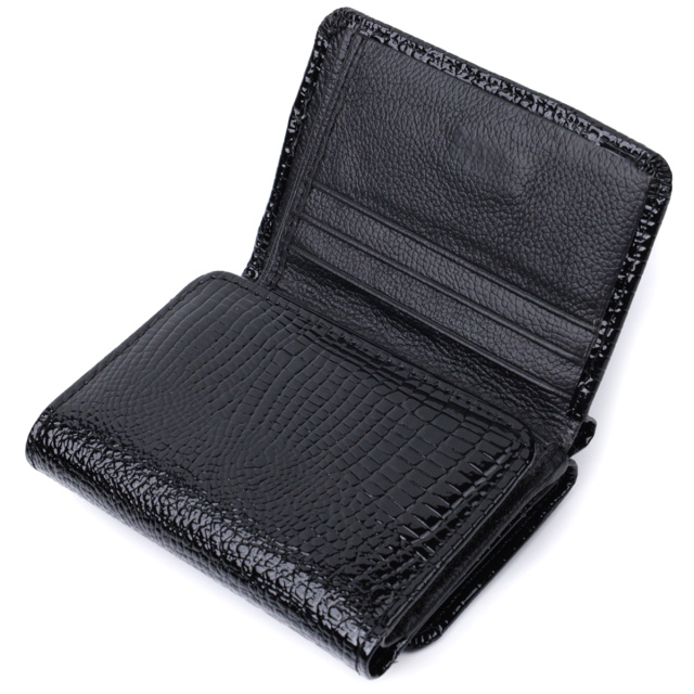 Женский кошелек из натуральной лакированной кожи, с тиснением под рептилию. Модель имеет удобный размер и закрывается на магнит. Снаружи можно увидеть отделение для монет, которое закрывается клапаном на магнит. Аксессуар внутри оснащен двумя отделениями для купюр и восемью ячейками для карт. Упакован аксессуар в белую плотную картонную коробку с фирменным логотипом.