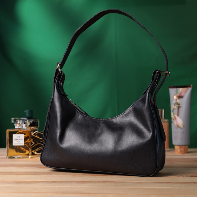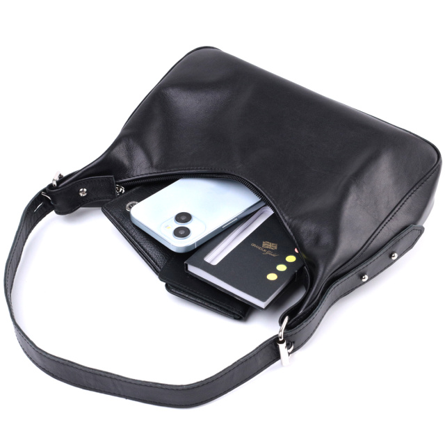 Изящная женская сумка для тех, кто любит красивый дизайн без лишних деталей. Это небольшая сумка с коротким ремнем, которую удобно носить под рукой, она обрела свою популярность благодаря своему универсальному дизайну и необычной форме.  Такая сумка в модном мире имеет название - сумка багет. Цвет изделия – классический черный, фактура – гладкая, с глянцевым блеском. Материал исполнения – натуральная мягкая кожа с высокими показателями качества. Отличный вариант сумки на каждый день, ведь она не только привлекательна снаружи, но и оснащена разумной системой внутренних отделений, что позволит продуманно и органично организовать пространство внутри. Модель изготовлена из качественных материалов и хорошо держит форму.