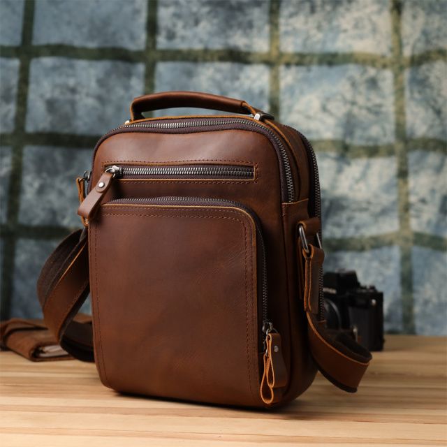 Коричневая кожаная сумка через плечо — стильный и практичный аксессуар на каждый день. Изготовлена из натуральной кожи с выразительной текстурой, дополнена фурнитурой цвета серебра. Модель оснащена двумя основными отделениями на молнии, внутри — потайной карман на задней стенке. На лицевой стороне размещены накладной кармашек и горизонтальный встроенный карман — оба на молнии. На тыльной стороне расположен еще один карман на молнии. Удобство переноски обеспечивают кожаная ручка и несъемный регулируемый кожаный ремешок через плечо. Продуманная конструкция и благородный цвет делают эту сумку идеальным спутником для динамичного ритма жизни.