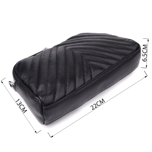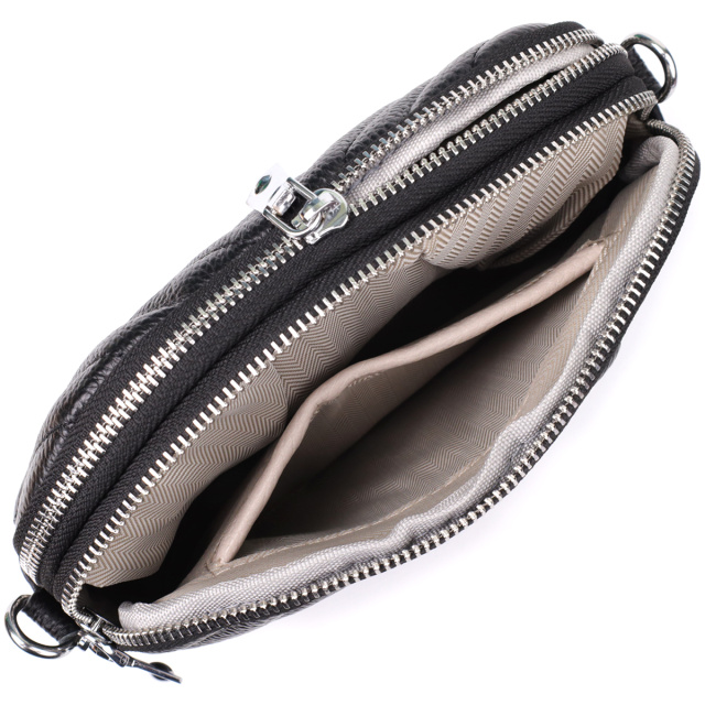 Фурнитура серебристого цвета гармонично дополняет чёрный оттенок кожи, придавая образу сдержанный блеск и элегантность. В комплект входит съёмный кожаный ремень, позволяющий носить сумку на плече или через плечо, адаптируя её под повседневный ритм и стиль.