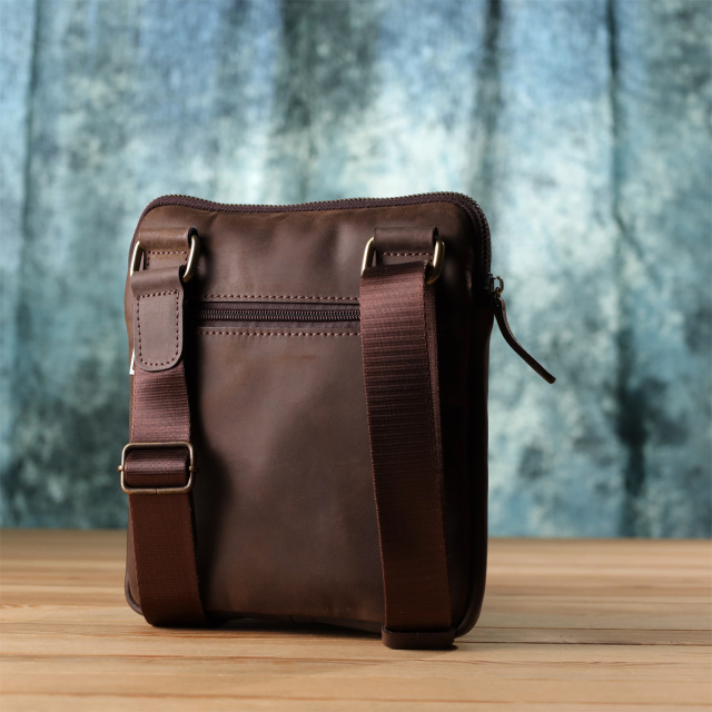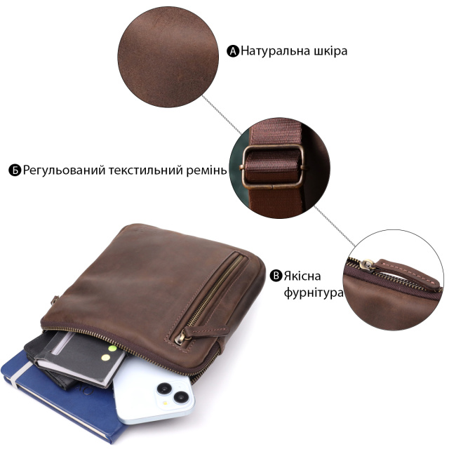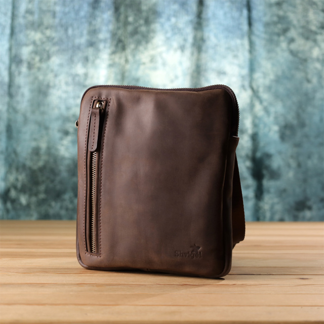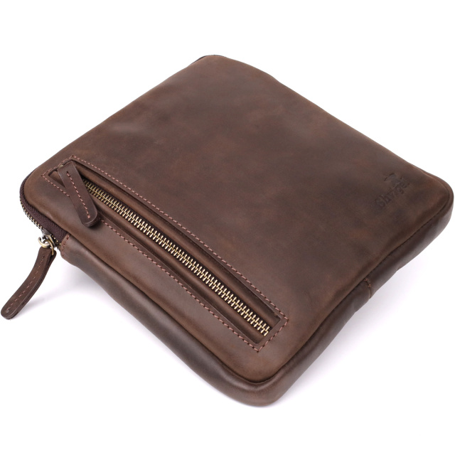 Стильная мужская вертикальная сумка SHVIGEL выполнена из натуральной коричневой винтажной кожи, которая со временем приобретает благородный оттенок и шарм. Компактный размер и продуманное внутреннее наполнение делают аксессуар практичным и удобным для повседневного использования.
