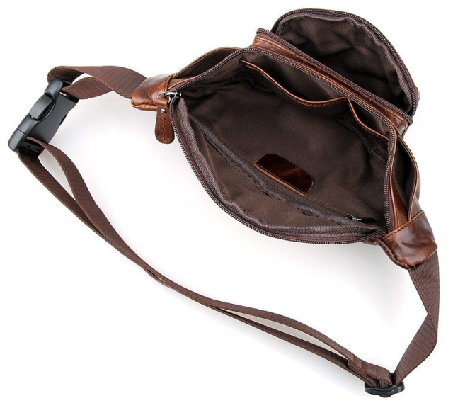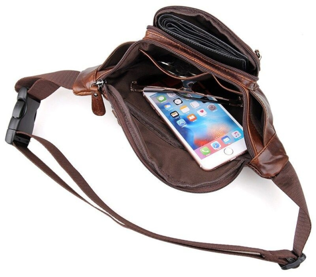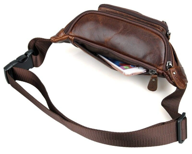 Сверхпрочная поясная кожаная сумка. Поясной ремень регулируется по длине и выполнен из прочного текстильного материала черно цвета. Цвет фурнитуры: темное серебро. Аксессуар аккуратно прошит темно-коричневой нитью. Сумка упакована в текстильный пылезащитный чехол белого цвета.