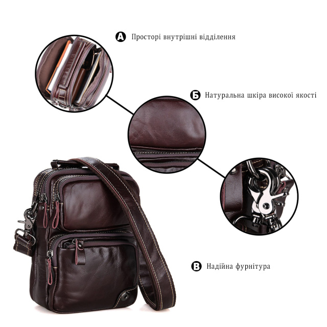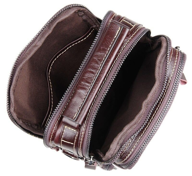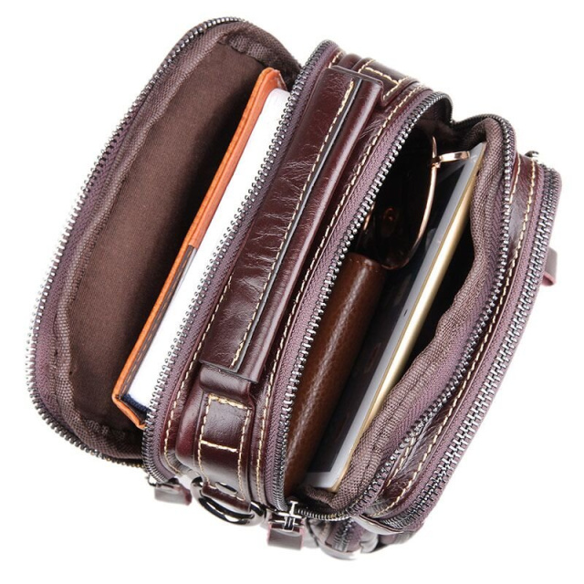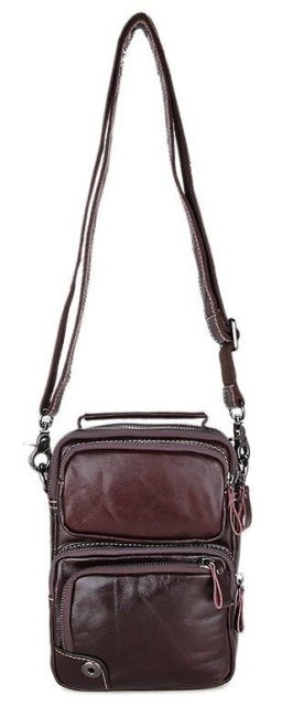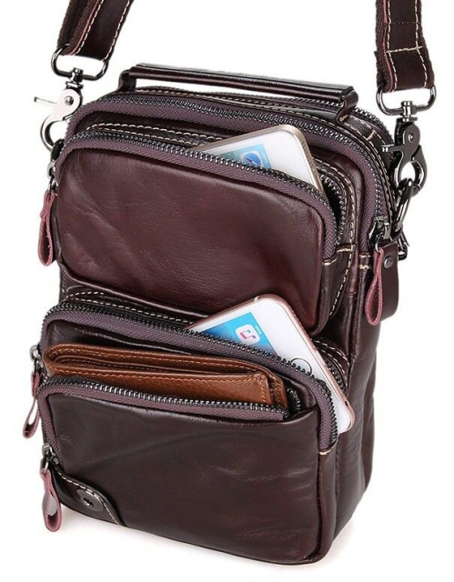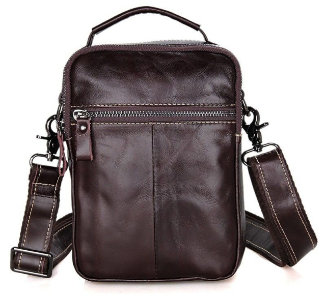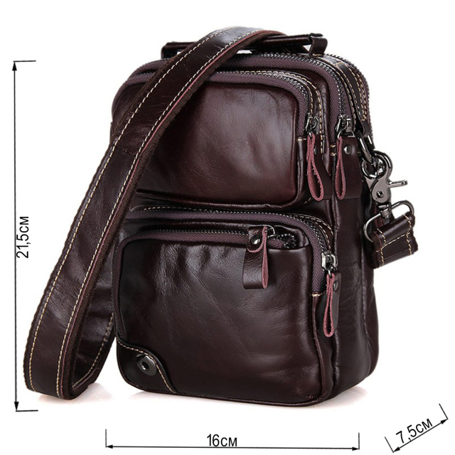 Современная мужская кожаная сумка небольших размеров. Цвет фурнитуры: темное серебро. Несмотря на свои компактные размеры, данная модель достаточно вместительна и функциональна. На лицевой стороне расположено три накладных кармана на молнии. На задней внешней стороне находится отделение на молнии.