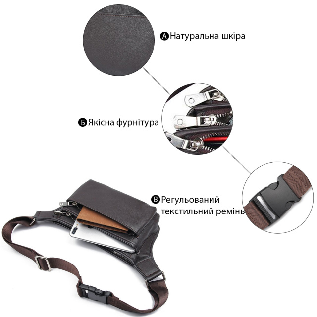 Стильная поясная сумка. Модель выполнена из натуральной кожи. Мягкая и не имеет лишнего веса. С такой поясной сумкой вам будет очень удобно в поездках. Вы можете не переживать ведь с такой сумкой ваши вещи будут в безопасности. Кожаная сумка не требует особого ухода за собой и не прихотлива. Модель упакована в текстильный пылезащитный чехол. Сумка будет прекрасным подарком для близкого человека.