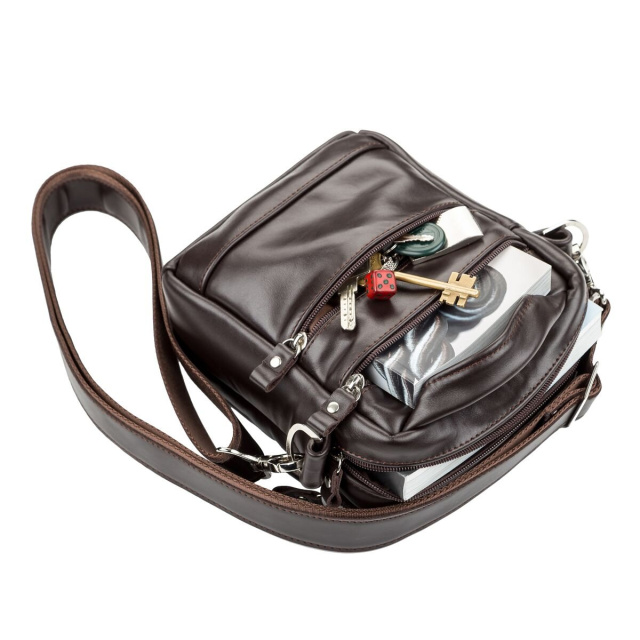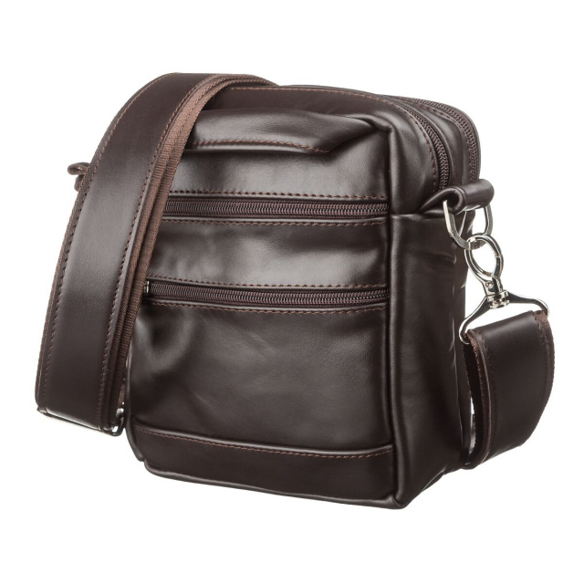 Коричневая небольшая мужская кожаная сумка для автомобилистов, из гладкой кожи, мягкой и приятной на ощупь. Несмотря на свои компактные размеры, аксессуар является весьма вместительным и функциональным. Цвет фурнитуры: серебро. Сумку можно носить через плечо, в наличии сьемный ремень, который изготовлен из комбинации кожи и ременной ленты, а также в руке. На лицевой стороне расположено отделение на молнии. На задней внешней стороне находятся два небольших отделения на молниях. Сумка имеет сразу два автономных отделения на молниях. В одном из этих отделений находится потайной карман на молнии.