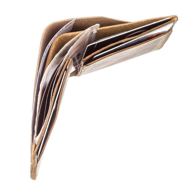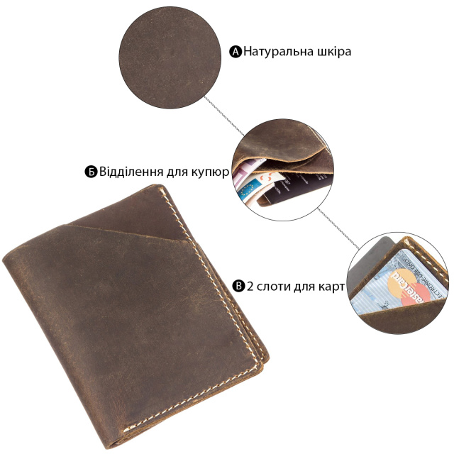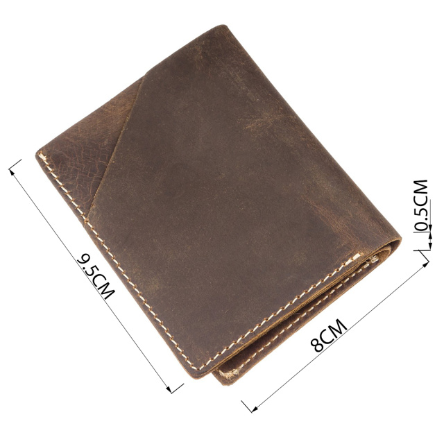 Компактный бумажник с минимальным размером темно-коричневого цвета. Модель обладает минимальным, но самым необходимым функционалом. Бумажник вместится в карман брюк. Изделие подходит как мужчинам, так и женщинам. Винтажная кожа, из которой выполнен бумажник пользуется особенной популярностью среди клиентов. А ее основной изюминкой является то, что со временем на такой коже выступают своеобразные царапины и потертости, которые придают ей шарм. Такой бумажник будет чудесным подарком для ваших близких.