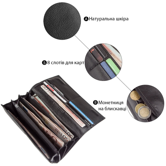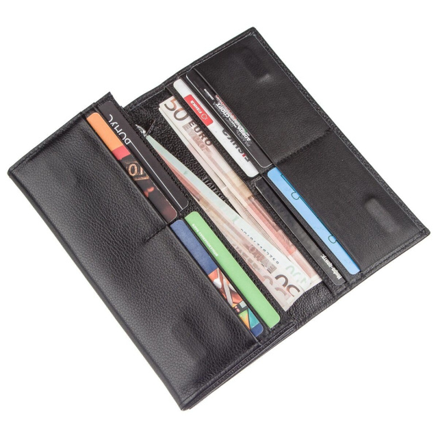 Вместительный и восхитительный женский кошелек. Модель выполнена в классическом черном цвете, который вам подойдет под любые вещи обувь и аксессуары. Выполнено изделие из мягкой плотной кожи, приятной на ощупь и дополнено качественной фурнитурой серебристого цвета. Модель в коже флотар, которая проносится значительно больше. Такой кошелек станет идеальным помощником для вас и ваших необходимых мелочей. Данная модель станет прекрасным подарком для любой девушки. В комплекте идет картонная фирменная коробка белого цвета.