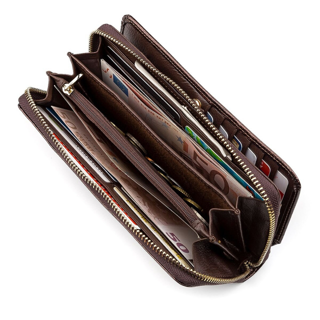 Шикарный кошелек очень понравится многим женщинам, даже несмотря на то, что он оформлен в классическом коричневом цвете, декорирован узором под крокодиловую кожу с лакированным покрытием. Закрывается аксессуар на качественную молнию, при этом дополнительный блок для платежных карт на кнопке. Внутреннего пространства достаточно для комфортного размещения бумажных банкнот и монет, для которых есть карман на молнии. Фурнитура надежная металлическая, выполнена в золотистом цвете, а красочная коробка от производителя позволит использовать аксессуар в качестве подарка.