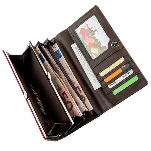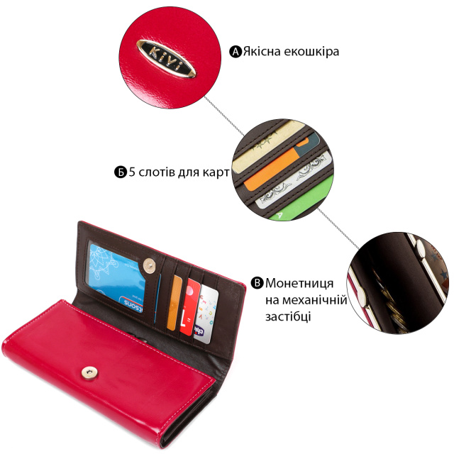 Данный малиновый кошелек из экокожи имеет 3 удобных отделения для купюр, автономный блок для карточек и монетницу с механическим фиксатором. Аксессуар закрывается на клапан с кнопкой магнитной. С таким кошельком вам становится удобнее сохранят в порядке купюры, карточки и монеты. Его дизайн и цвет прекрасно подчеркнут ваш вкус. Аксессуар легко поместится в женскую сумочку. Кошелек станет прекрасным подарком для близкого.