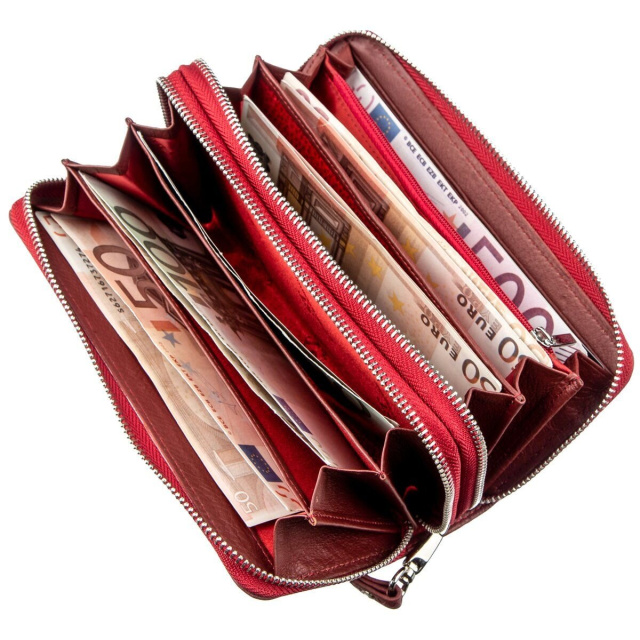 Многофункциональный и удобный клатч для прагматичных и деловых женщин. Цвет – темно-красный с нотками бордового, оттенок – матовый. Выполнен из натуральной кожи высокого класса. Дизайн отличается своей сдержанностью и практичностью. Имеет два автономных отделения, которые закрываются на удобную массивную молнию. Внутри расположено шесть больших отделений для различных ценных вещей. Для монет предусмотрено отделение на молнии, также есть восемь карманов для карт и кредиток. Если Вы захотите носить только клатч, то для удобства есть съемный ремешок на кисть. Упакован аксессуар в белую картонную коробку с логотипом производителя.