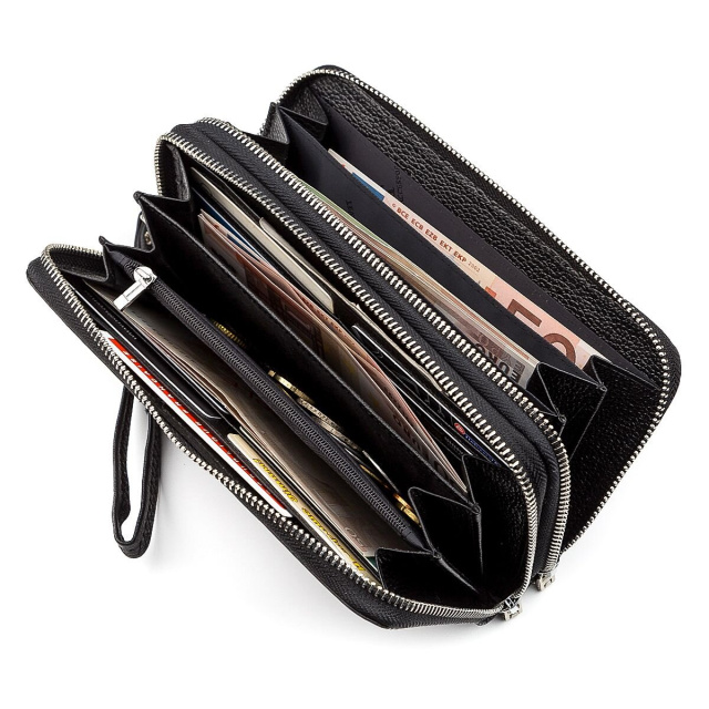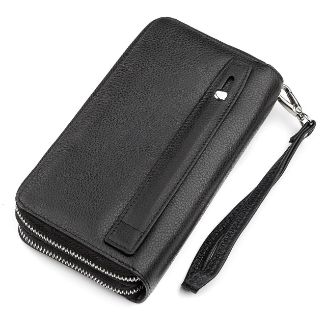 Данная модель производится в классическом стиле и солидном черном цвете. Для максимальной удобности кошелек разделен на два больших отделения, внутри которых можно без проблем размещать бумажные банкноты, банковские карты и даже смартфон. По бокам есть дополнительные отделения и секции для дисконтных карт, а благодаря качественной, натуральной коже, аксессуар приятно ощущается в руках и не доставляет дискомфорта при ношении. Имеется также ручка для ладони и ремешок для запястья. Эту модель и многие другие можно приобрести на сайте нашего интернет-магазина, который предлагает качественные изделия по приемлемой стоимости.