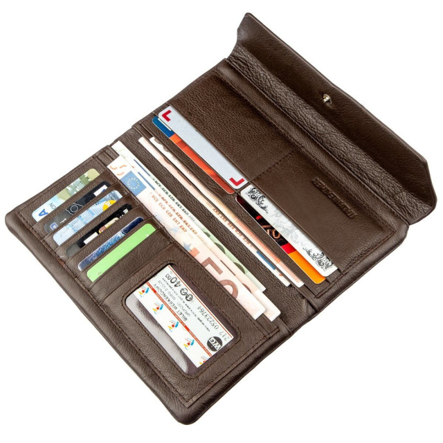 Фешенебельный женский кошелек-клатч из натуральной кожи, красивого и стильного коричневого цвета. Он имеет много различных отделений и карманов, поэтому можете не переживать, ведь в него поместятся все Ваши необходимые ценности. Данный клатч можно носить в сумке, портфеле, а также как самостоятельный и самодостаточный аксессуар. Хозяйке такого кошелька непременно позавидуют в ее окружение, ведь чувство стиля и вкус сразу бросаются в глаза. Поэтому спешите купить клатч для себя или на подарок близкому человеку. При покупке кошелька, он будет упакован в фирменную картонную коробку белого цвета.