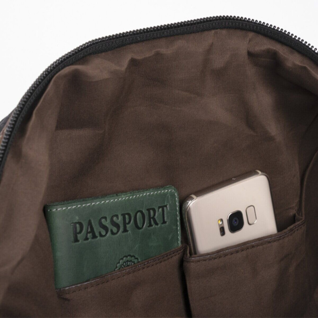 - основное отделение на молнии с потайным карманом на молнии, уплотненным карманом на молнии и двумя накладными карманами;