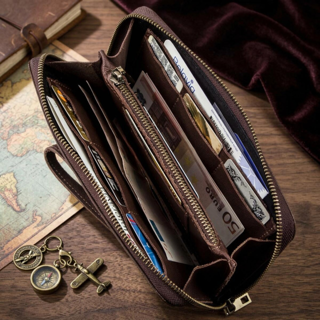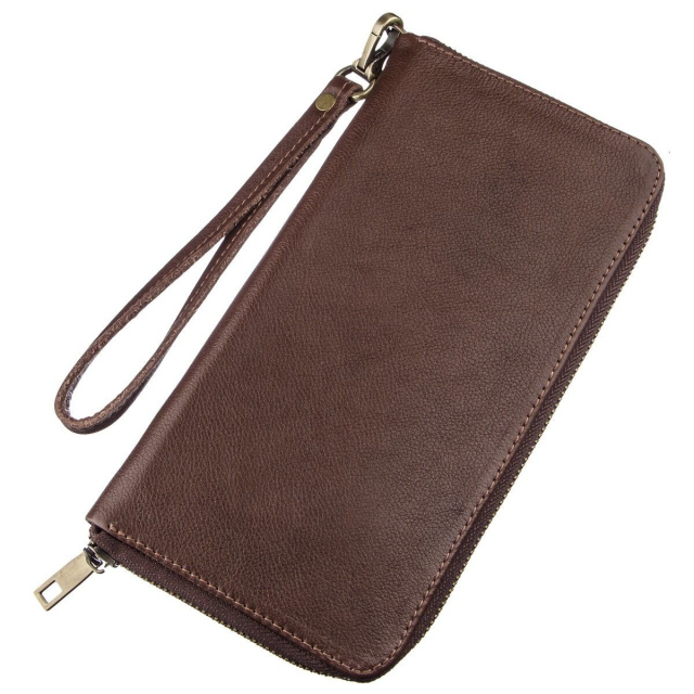 Особенности: горизонтальный формат, ремешок на запястье, для карт, купюр и документов.
