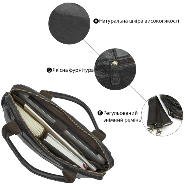 Цвет: черный; Материал: натуральная кожа высокого качества; Размер (ШхВхГ, см): 36х26х6,5; Страна производитель: Китай. Описание: - отделение