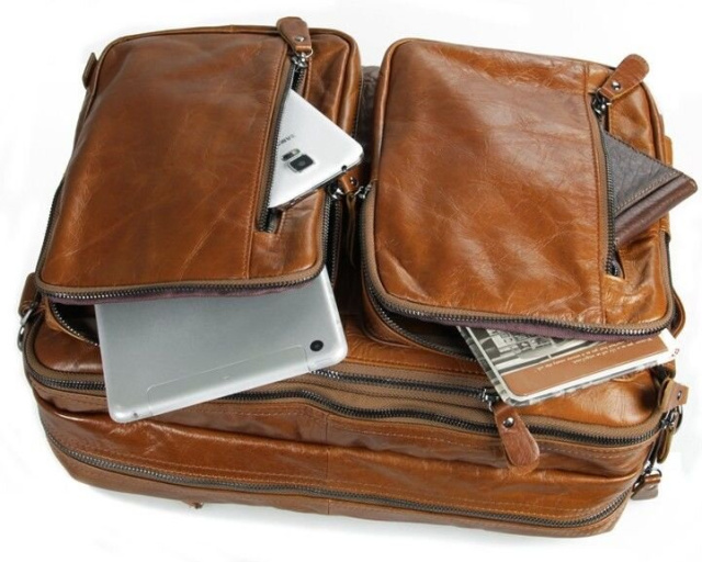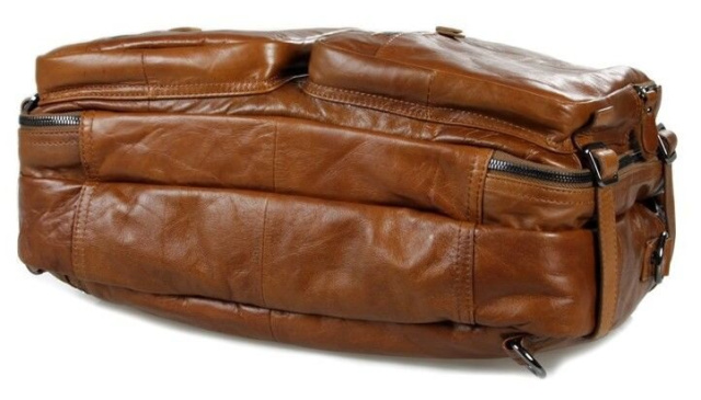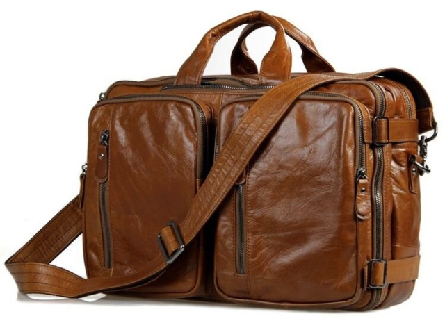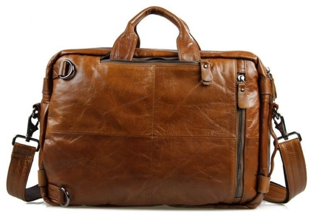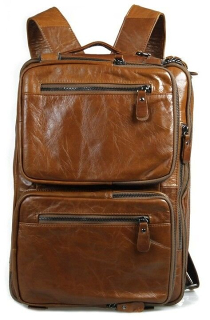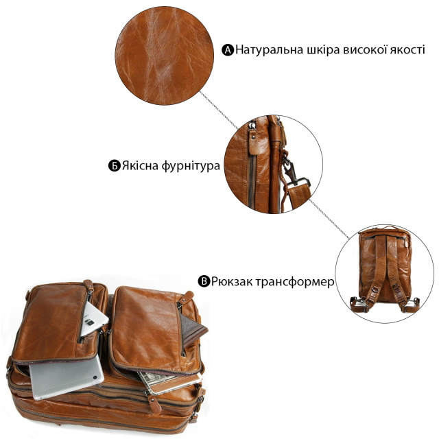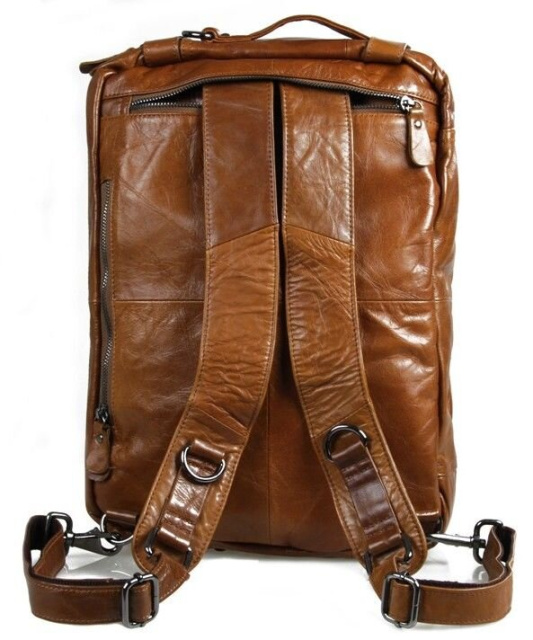 Великолепная мужская кожаная сумка-трансформер рыжого цвета. Данную модель можно носить в руке, через плечо или же как рюкзак. Цвет фурнитуры: темное серебро. На лицевой стороне изделия находится 4 отделения на молнии. Предусмотрены специальные карманчики на молнии в которые можно прятать кожаные ручки. Сумка упакована в текстильный пылезащитный чехол белого цвета.